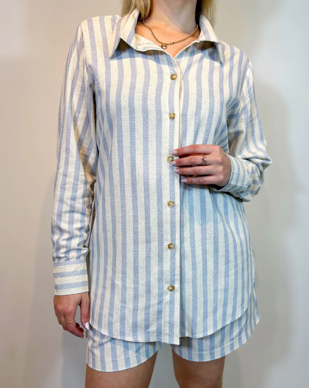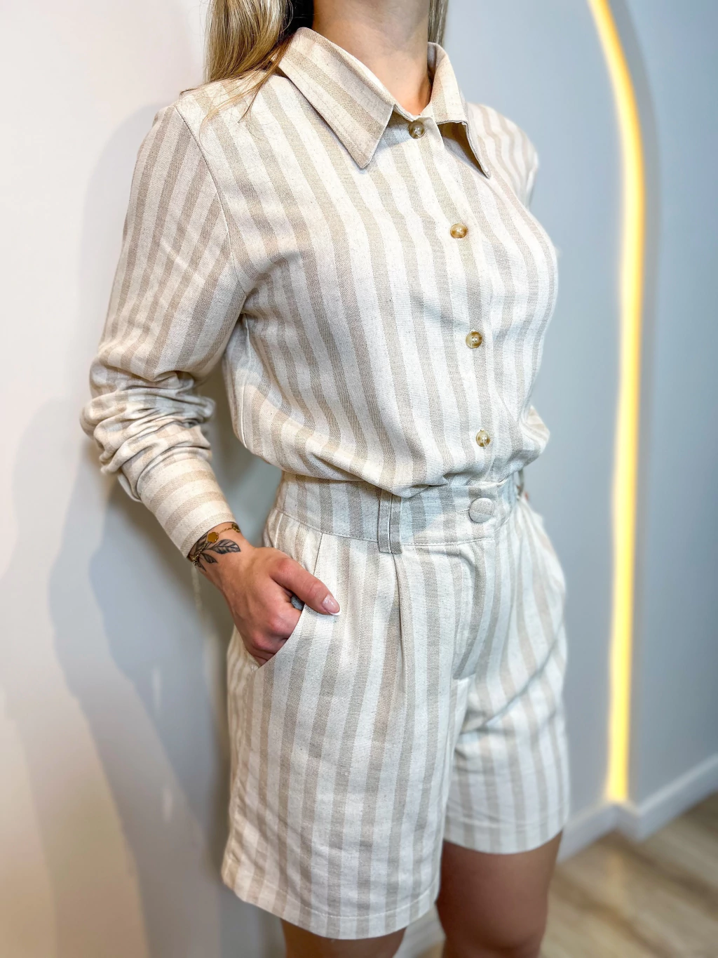 Feito em linho com algodão, esse conjunto traz frescor, conforto e um caimento impecável. A padronagem listrada em tons neutros garante sofisticação sem exageros e combina com tudo, a escolha certa para quem busca praticidade e estilo em qualquer ocasião.